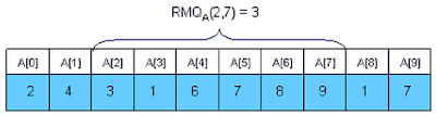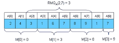 전처리 후, i에서부터 j까지의 최소값은 아래와 같이 구할 수 있다. $K$를 $\log{j} - i + 1$라 하면, $$ RMQ_A(i, j) = \begin{cases} M[i][k], & A[M[i][k]] <= A[M[j-2^k+1][k]] \[2ex] M[j-2^k+1][k], & \text{otherwise} \end{cases} $$