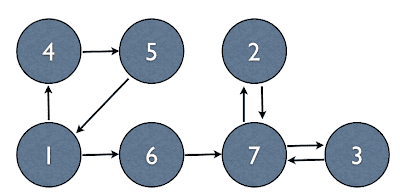 방향 그래프에서 $SCC$를 구하는 문제이다. $SCC$란 방향그래프에서 정점의 최대 부분집합을 뜻하며 부분집합의 서로 다른 임의의 두 정점 $u$에서 $v$로 가는 경로와, $v$에서 $u$로 가는 경로가 모두 존재하는 경우를 말한다. 아래와 같은 그래프에서는 $(1,4,5)$ , $(6)$ ,$(2,3,7)$의 세 $SCC$가 만들어진다.