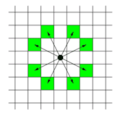 나이트가 한 번에 이동할 수 있는 위치가 아래와 같이 있고, 현재 위치와 목적지 위치가 주어졌을 때 현재 위치에서 목적지까지의 최단거리를 구하는 문제이다. 체스판은 정사각형이며 한 변의 길이 $L$이 주어진다$(1\leq{}L\leq{}300)$.